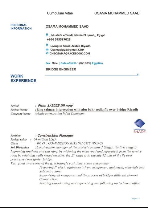 I am civil engineer has more than 10 years experience in construction field especially bridges. I have worked in Saudi Arabia for one year for shade company as a cm and I am looking now for a better opportunity. I am working now in ryiadh in king Salman bridge as a constrution manager I hope to find agood chance