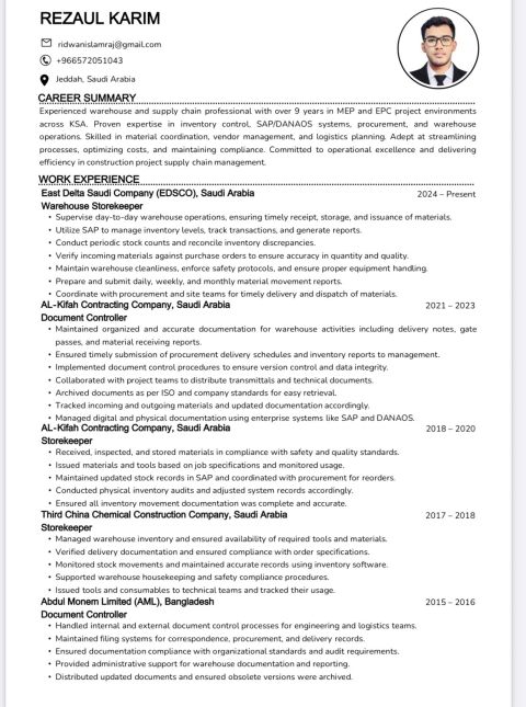 I am looking for a Storekeeper, Material Controller, Data Entry position. I have 9 years of work experience in the construction industry and currently I work at East Delta Saudi Company Limited, Jeddah, Saudi Arabia. my contact