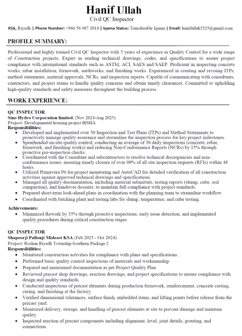 I am Hanif Ullah, a Civil QC Inspector with 5 + years of experience in quality control, inspection, and construction supervision for major residential and infrastructure projects across Saudi Arabia. During my work with Sino Hydro Corporation, Shapoorji Pallonji Mideast, and Bin Dayel Contracting Ltd. I ve gained solid expertise in QA/ QC procedures and documentation (ITPs, MIRs, NCRs, Method Statements)
