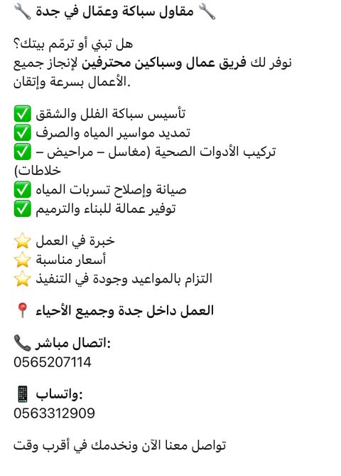 مقاول سباكة وعمال في جدة نوفر لك فريق عمال وسباكين محترفين لانجاز جميع الأعمال بسرعة واتقان باقي التفاصيل تجده في الصورة المعلنه في الاعلان