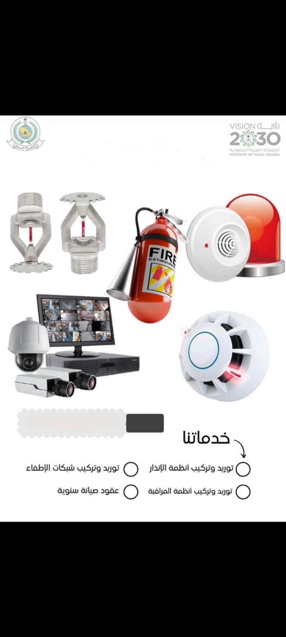 أمن وسلامة لجميع المنشاءات سواء كنت تمتلك شركة - مكتب - مستودع - قاعة - عيادة - مستشفى - مصنع نقدم لك خدماتنا الشاملة في الأمن والسلامة توريد وتركيب اجهزة الانذار والاطفاء - توريد وتركيب كاميرات المراقبة - عمل عقود صيانة سنوية - عمل مخططات سلامة - اصدار شهادة انهاء أعمال - اصدار تقرير فني هندسي - اصدار شهادة تركيب أدوات السلامة - اصدار شهادة انجاز