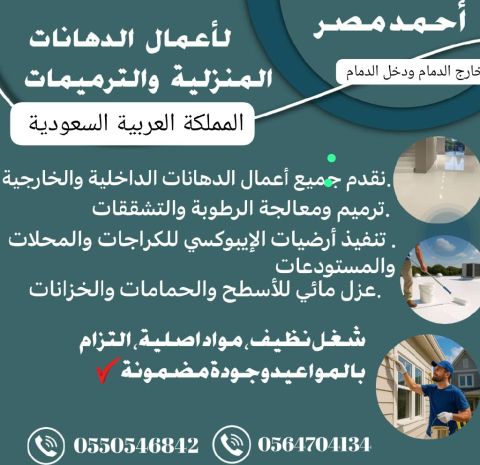 اللي عنده عمل في جميع أعمال الدهانات الداخلية وكذلك أعمال العوازل المائية والحرارية والايبوكسي للأسطح والخزانات والمواقف والمستودعات ومعالجة الخرسانة أنا جاهز للعمل