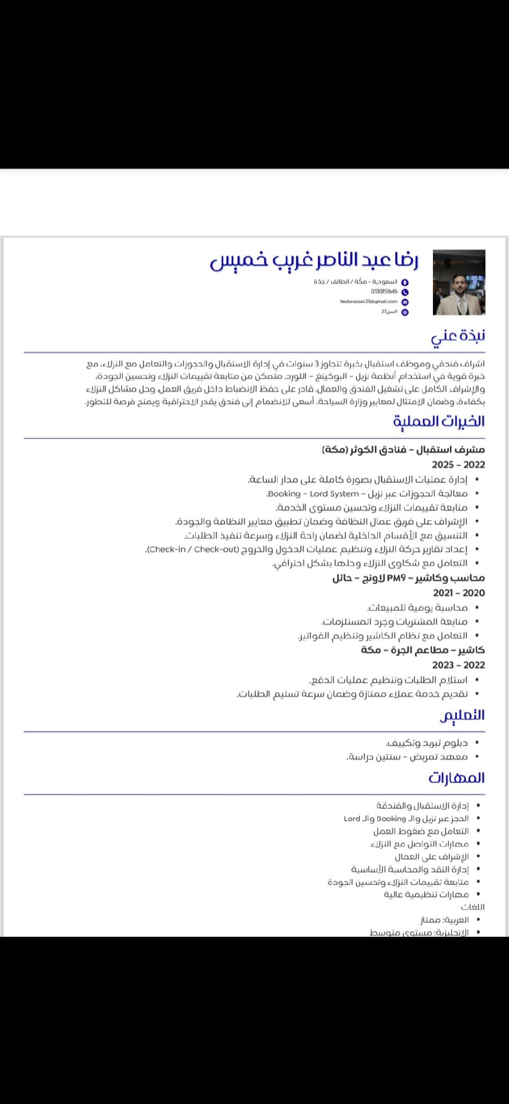 الرجاء الاطلاع على أل CV أقامه سارية متواجد حاليا في الطائف خبرة 3 أعوام بمجال الفندق بالاستقبال وحجوزات البوكينك واستعداد تام للتحرك ولله ولي التوفيق