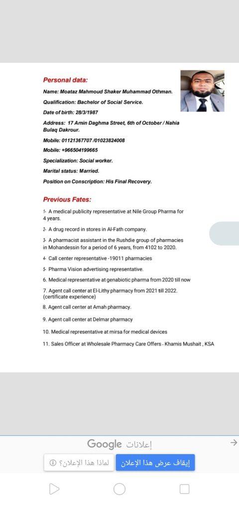 شاب مصري العمر 25 عام ابحث عن وظيفة، ولدي اقامة سارية لمدة عام كامل