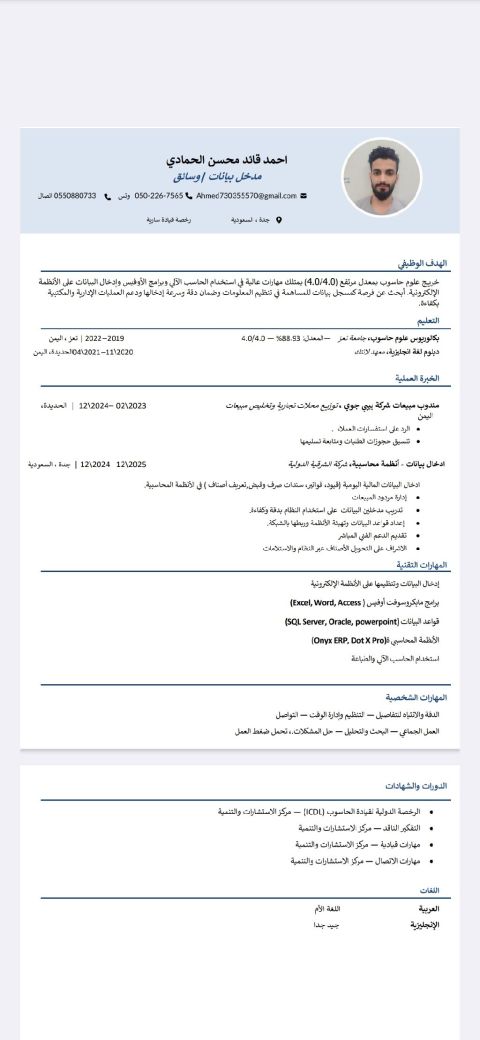 مدخل بيانات بخبرة 3 سنوات مدخل بيانات محترف بخبرة ثلاث سنوات في ادخال وتحديث البيانات بدقة عالية، ومراجعة المعلومات والتأكد من صحتها. لدي خبرة في التعامل مع قواعد البيانات، اعداد التقارير، وأرشفة الملفات الالكترونية والورقية. أجيد استخدام برامج Microsoft Office خاصة Excel وWord، مع سرعة في الطباعة وتركيز عال لتقليل الأخطاء. أتميز بالالتزام بالمواعيد، الدقة، تحمل ضغط العمل