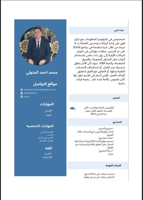 خريج بكالوريوس IT، متمكن من استخدام الحاسوب وبرامج Microsoft Office وسريع التعلم وقادر على التكيف مع مختلف بيئات العمل. لدي خبرة في إدارة المتاجر الالكترونية وتطبيقات التوصيل والتعامل مع منصات الشركاء الخاصة بها، بالاضافة الى خبرة في استخدام برنامج Onyx Pro لإدارة العمليات المحاسبية والادارية. كما امتلك خبرة في ادخال وتحديث بيانات المشاريع والمستندات في شركة عقارية، وتنظيم السجلات