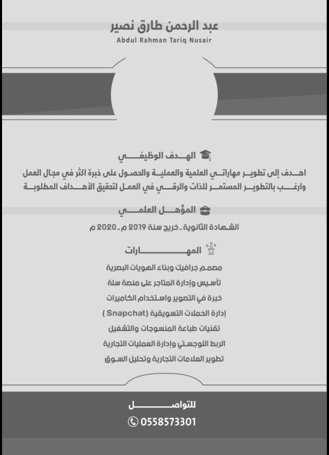 مصمم جرافيك عندي خبرة أكثر من أربع سنوات في المجال تصاميم التغليف والمطبوعات - الكروت الشخصية البزنس كارد - الشعارات والهويات البصرية بشكل عام. توقيعات الايميلات. بنرات المتاجر الالكترونية. وتصاميم السوشيال ميديا. وهذا ملف أعمالي