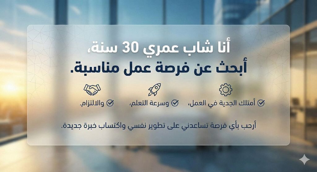 أنا شاب عمري 30 سنة، ابحث عن فرصة عمل مناسبة. امتلك الجدية في العمل، وسرعة التعلم، والالتزام. ارحب بأي فرصة تساعدني على تطوير نفسي واكتساب خبرة جديدة
