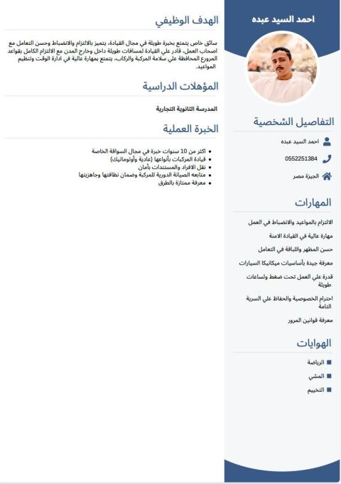 عنوان سائق مجرب في جدة (حي العزيزية) السلام عليكم. أنا سائق ذو خبرة تزيد عن 8 سنوات، ومقيم في حي العزيزية في جدة. حامل رخصة قيادة سعودية سارية معرفة تامة بشوارع جدة والمناطق القريبة التزام بقواعد القيادة الآمنة والدقة في المواعيد مهارة في الفحص الأساسي للمركبة ابحث عن عمل سائق خاص / سائق لشركة في جدة. الوثائق والمراجع متوفرة. يمكنني البدء فورا. للتواصل