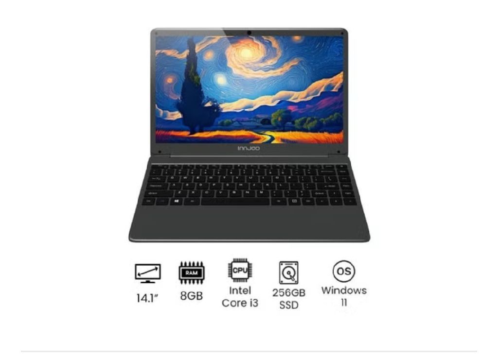 كمبيوتر محمول InnJoo G1 بشاشة مقاس 14.1 بوصة ومعالج Core i3 وذاكرة وصول عشوائي سعة 8 جيجابايت ومحرك أقراص SSD سعة 256 جيجابايت وبطارية بقدرة 40 وات في الساعة ونظام Win11