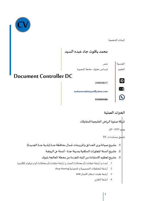 أطلب عمل منسق مستندات Document Controller (DC) للتواصل والاطلاع على السيرة الذاتية يرجى ارسال رسالة بالواتساب