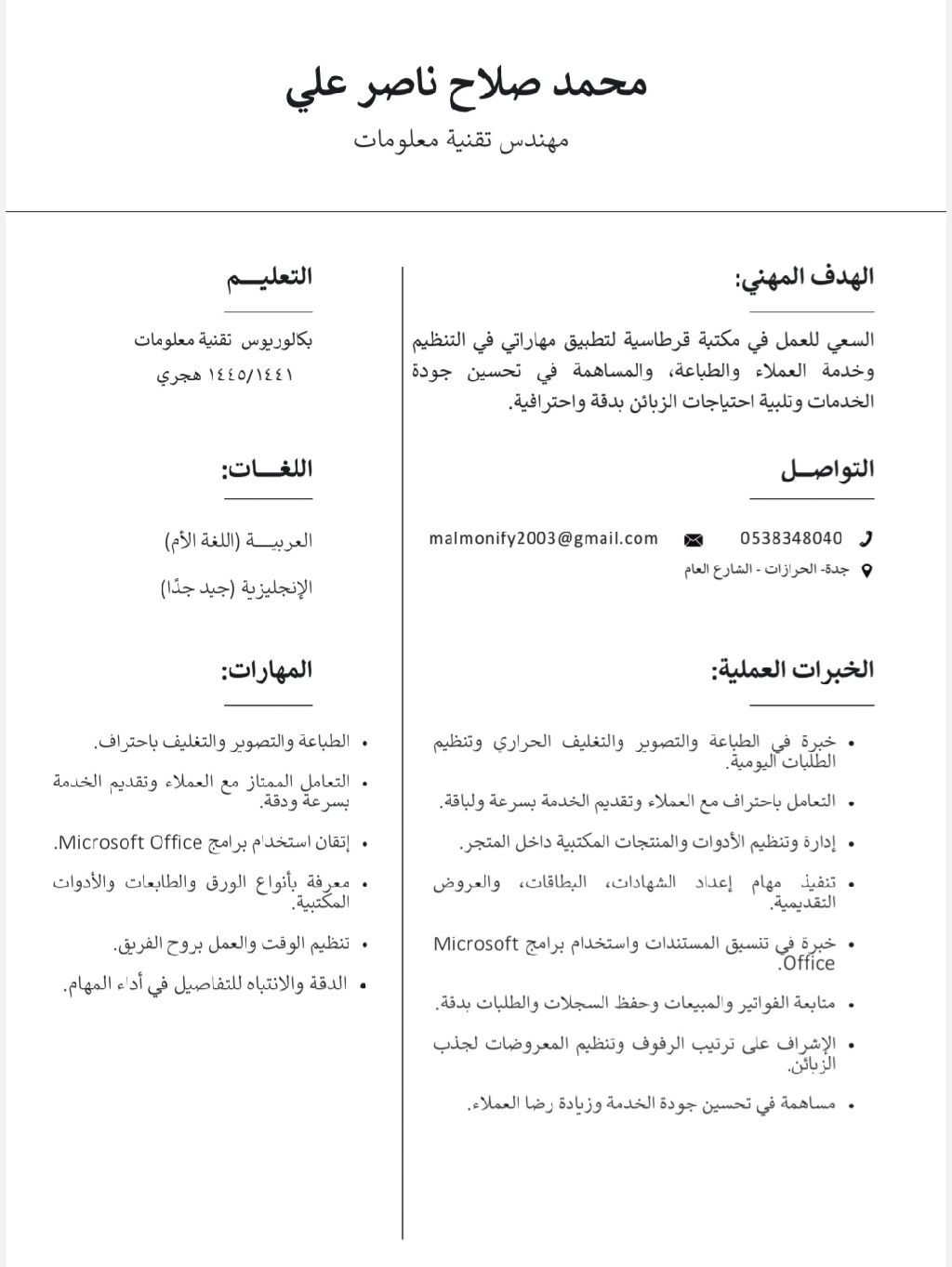 اسمي محمد صلاح يمني الجنسية ابحث عن فرصة عمل في مكتبة أو قرطاسية تقدم خدمات طلابية وعامة. امتلك روح المسؤولية والالتزام في انجاز المهام بدقة وسرعة، ولدي شغف في خدمة العملاء وتنظيم الأعمال المكتبية. أسعى لاكتساب الخبرة وتطوير مهاراتي في بيئة عمل مميزة تحقق النمو والتقدم المهني