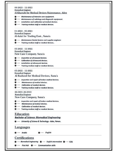 مهندس اجهزة طبية مقيم في المملكة العربية السعودية حاليا موجود في مكة المكرمة حاصل على شهادة البكالوريوس في الهندسة الطبية الحيوية متوفر خبرة 3 سنوات في نفس المجال. كفاءة في التركيب والصيانة والاصلاح للاجهزة الطبية. إقامة سارية قابلة للنقل مستعد للعمل الفوري