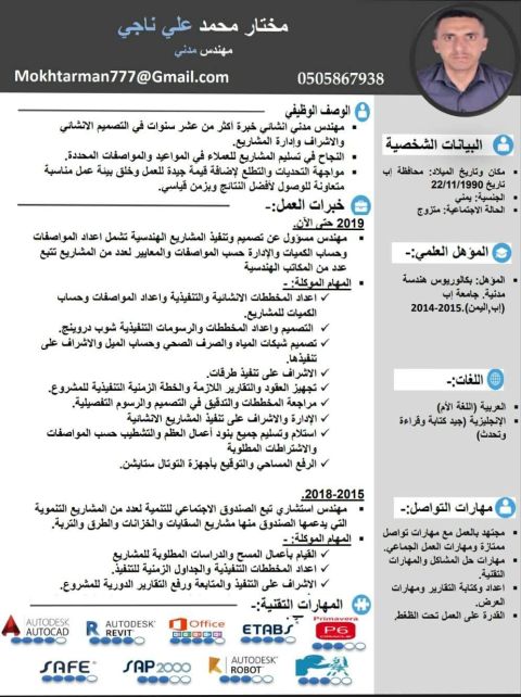 مهندس مدني يمني خبرة 10 سنوات متاح نقل كفالة جاهز للعمل فورا لدي خبرة في عمل التصاميم الانشائية والشوب درونج وAs - built وحساب الكميات والرفع المساحي والاشراف حسب متطلبات الكود السعودي والسلامة المهنية أتميز بالدقة والسرعة والقدرة على الإدارة وتوزيع المهام وتنظيم العمل