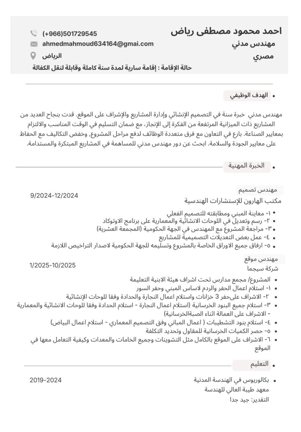مهندس مدني مصري الجنسية (معي رخصة قيادة سارية) خبرة سنة في مجال التنفيذ خريج 2024 مقيم في الرياض ابحث عن فرصة عمل مناسبة في الهندسة المدنية، خاصة في أعمال الخرسانات والمكتب الفني. لدي خبرة عملية لمدة سنة في موقع التنفيذ، بالاضافة الى AutoCAD، ومعرفة ببرامج SAP2000 وSAFE. كما لدي معرفة بأعمال الحصر واعداد الكميات، وأجيد استخدام برامج الأوفيس بشكل احترافي، وأقوم حاليا بدراسة كورس المكتب الفن