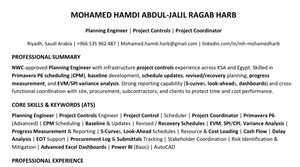 مهندس تخطيط معتمد من شركة المياه الوطنية خبرة باعداد الجداول الزمنية وتحميلها بالموارد والتكلفة ومتابعة التقدم واعداد التقارير اليومية والأسبوعية والشهرية وعمل داشبورد لمؤشرات الأداء وعمل جداول أل recovery & revised schedules بالاضافة لنظام اليونيفاير الخاص بال NWC ابحث عن شاغر ملائم في المدينة المنورة أو المنطقة الغربية