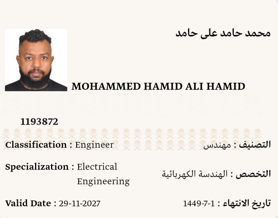 مهندس كهربائي، سوداني، معتمد من الهيئة السعودية للمهندسين، له أكثر من 9 سنوات من الخبرة كمهندس صيانة وتشغيل (Facilities Engineer) وأنظمة التوزيع الكهربائية (LV & MV) والطاقة الشمسية (Solar Energy) ماهر في التصميم والاشراف وصيانة المرافق الكهربائية وأنظمة التوزيع منخفضة ومتوسطة الجهد، والمولدات (Generators) والتكيف المركزي HVAC، والطاقة الشمسية. متمكن من استخدام Revit MEP وAutoCAD وPVsyst وETAP