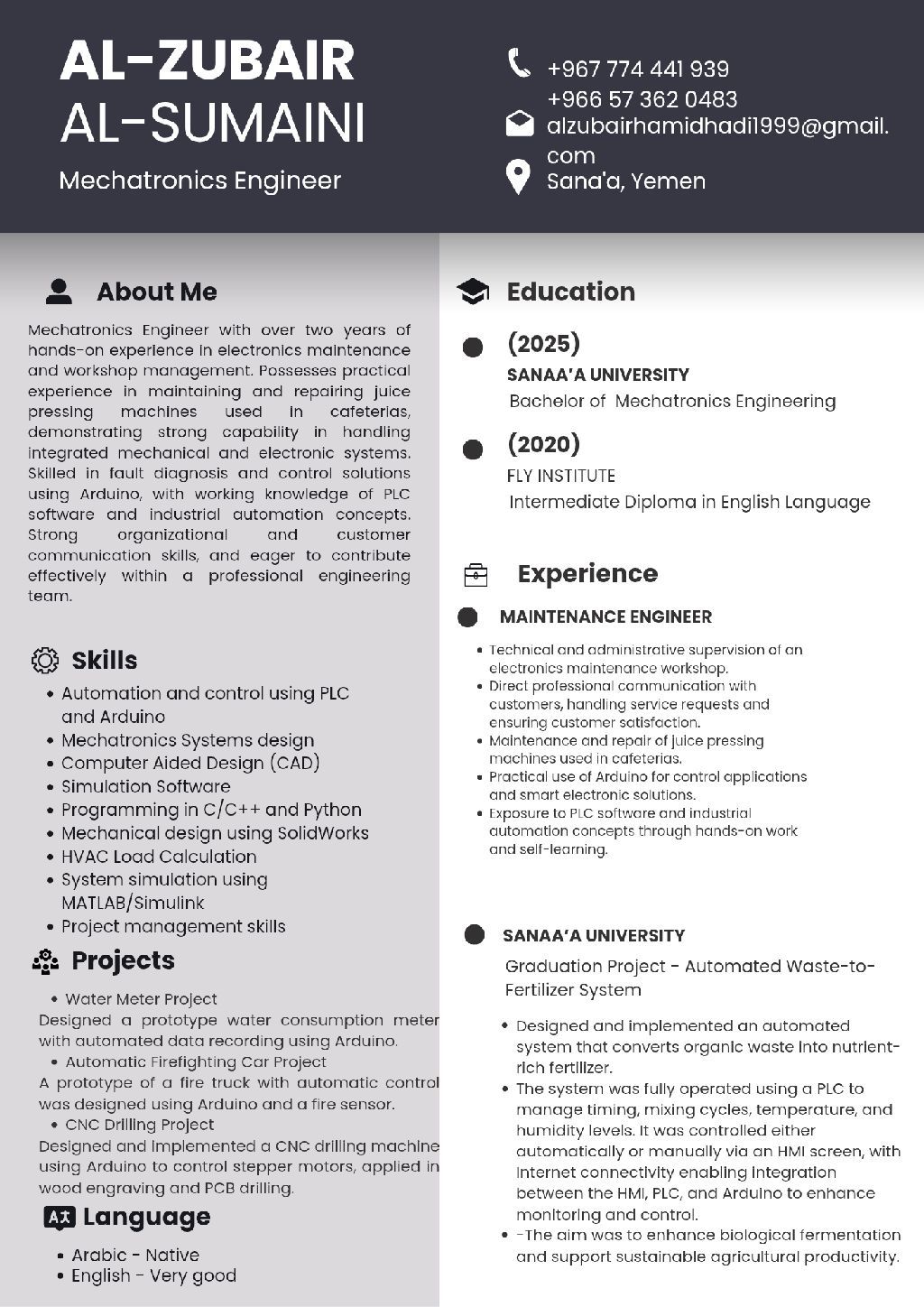 مهندس ميكاترونيكس يتمتع بخبرة عملية تتجاوز السنتين في صيانة وإدارة ورش الالكترونيات، مع مهارات متقدمة في التحكم والبرمجة باستخدام الأردوينوا. خلال فترة عملي، توليت مسؤولية الاشراف الفني والاداري على محل متخصص في صيانة الاجهزة الالكترونية، حيث اكتسبت خبرة واسعة في تحليل الأعطال المعقدة، وتقديم الحلول الفعالة، كما لدي خبرة عملية في صيانة واصلاح مكائن كبس العصير المستخدمة في الكافتيريات