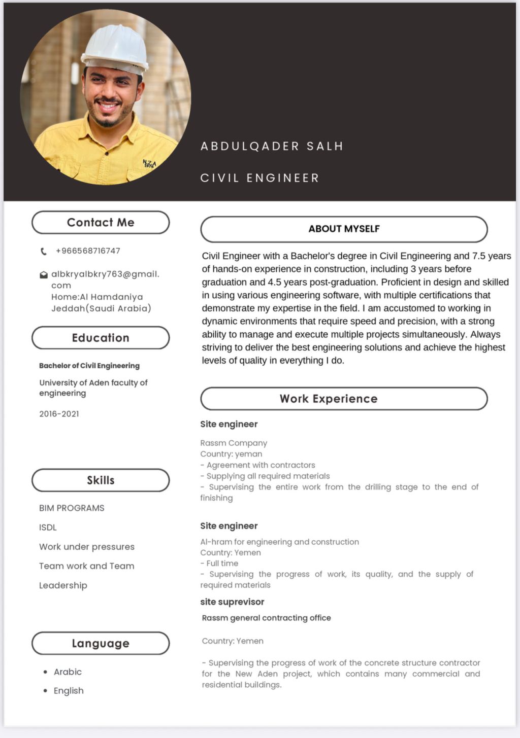 مهندس مدني متخصص في أعمال الخرسانة والتشطيبات، امتلك خبرة في تنفيذ واشراف المشاريع وفق المخططات والمواصفات الفنية مع الالتزام بالجودة والسلامة وتحقيق أفضل النتائج في الموقع