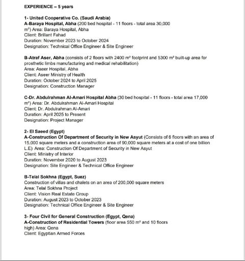 Civil engineer with 10 years of experience in Saudi Arabia + 3 years in Egypt. Supervising project execution. Experienced in infrastructure and construction projects, quantity surveying, and preparing payment certificates. Transfer of sponsorship available