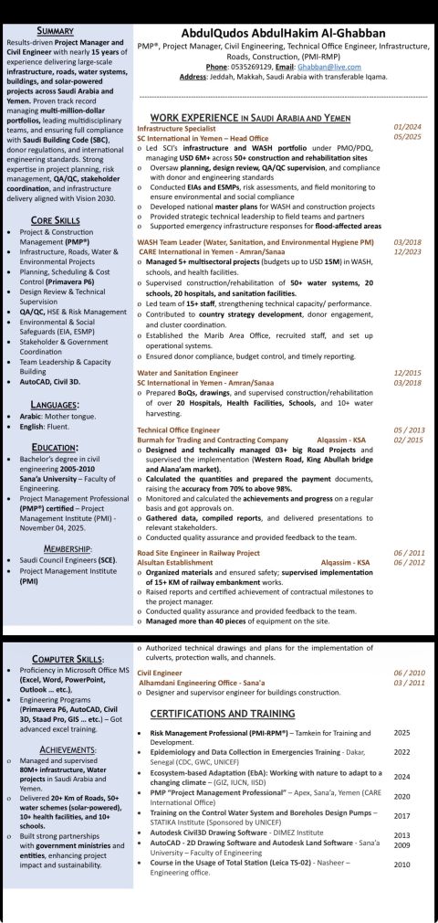 Civil engineer, PMP, MBA with 15 years experience in KSA and with international organizations. English language and transferable Iqama. Project management, construction, infrastructure and environment