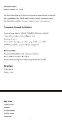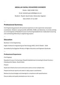 Civil Engineer based in Riyadh with one year of experience in construction and civil projects. Skilled in project execution, site supervision, concrete works, quantity surveying, and preparing shop drawings. Proficient in structural design software SAP2000, ETABS, SAFE, AutoCAD, and MS Office. Seeking a suitable opportunity in construction or engineering offices, ready to join immediately