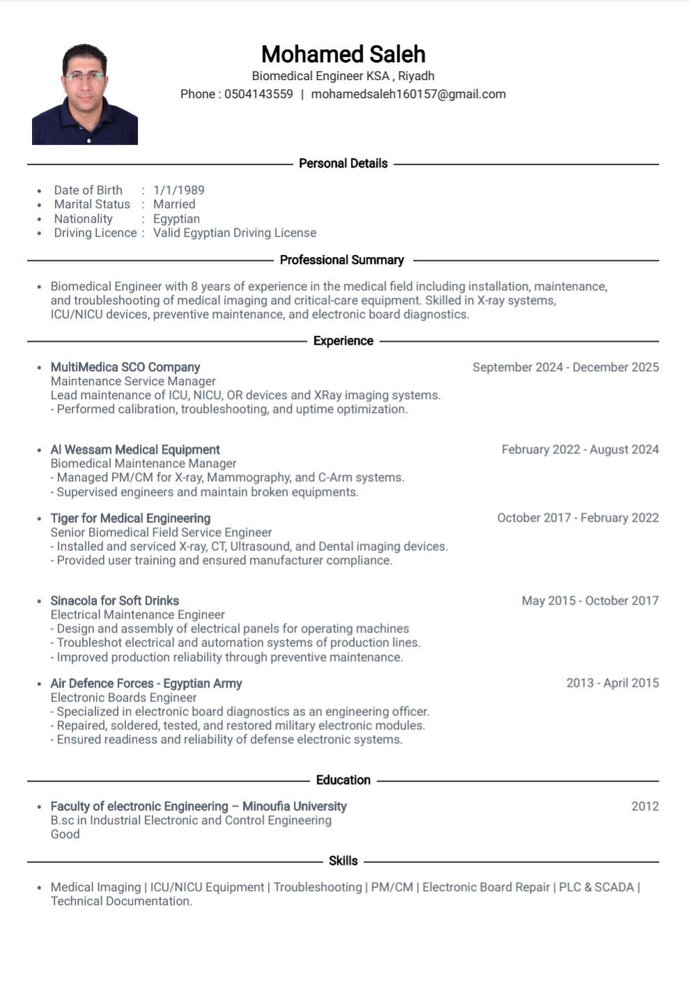 مهندس صيانة اجهزة طبية بخبرة 8 سنوات في المجال الطبي، بما في ذلك تركيب وصيانة واصلاح أعطال اجهزة التصوير الطبي. ماهر في أنظمة الأشعة السينية XRay بكافة أنواعها واجهزة السونار والأشعة المقطعية واجهزة الأسنان وسبق لي العمل على اجهزة (Toshiba، GE Siemens، Phillips, Carestream, Italray, Genesis) واجهزة غرف العمليات والرعاية وأتطلع الى اكتساب خبرات جديدة من العمل في فروع الاجهزة الطبية الأخرى