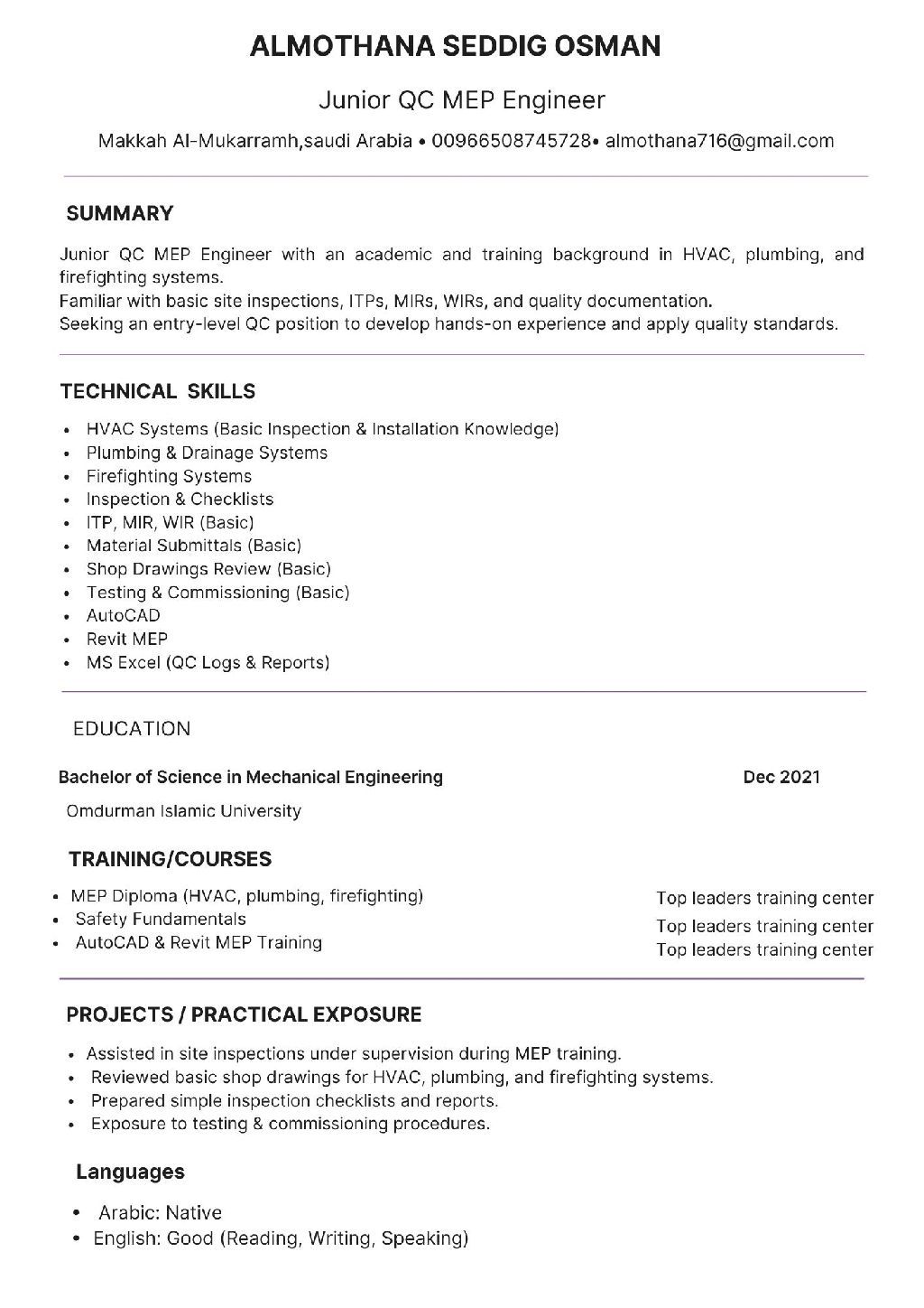 Mechanical Engineer specialized in Quality Control (QC) with practical training in HVAC, Plumbing, and Firefighting systems. Skilled in reviewing drawings, supervising site activities, and preparing quality control reports, with good knowledge of technical specifications and codes. Seeking a suitable job opportunity in QC or Site Engineering within Mecca