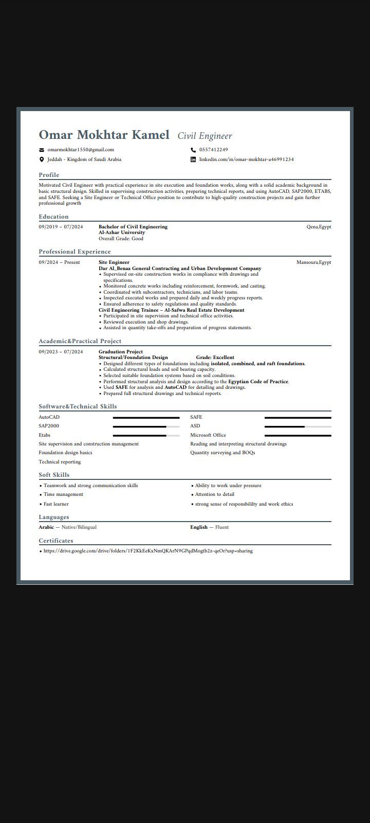 مهندس مدني خبرة سنة متخصص في التنفيذ والاشراف علي تشيد العناصر الانشائية المختلفة كما اعمل علي حصر الكميات وعمل مستخلصات خاصة مشروع البناء مع إقامة سارية قابلة للتحويل ورخصة سياقة