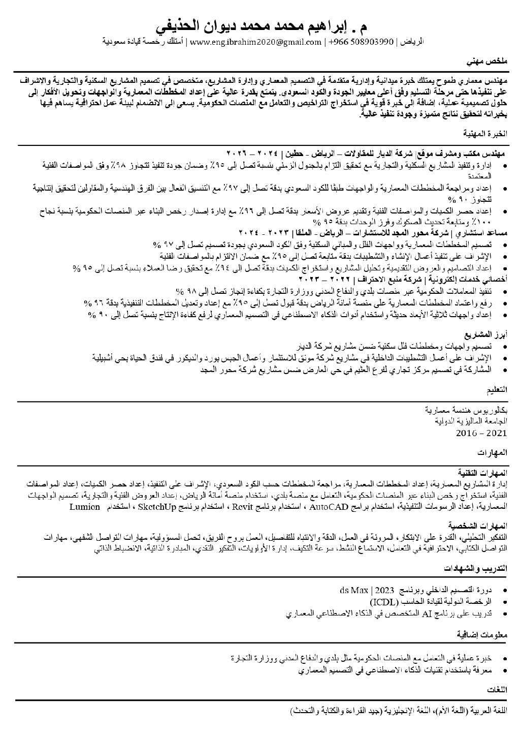 مهندس معماري ممارس تصميم واشراف التفاصيل في السيرة الذاتية