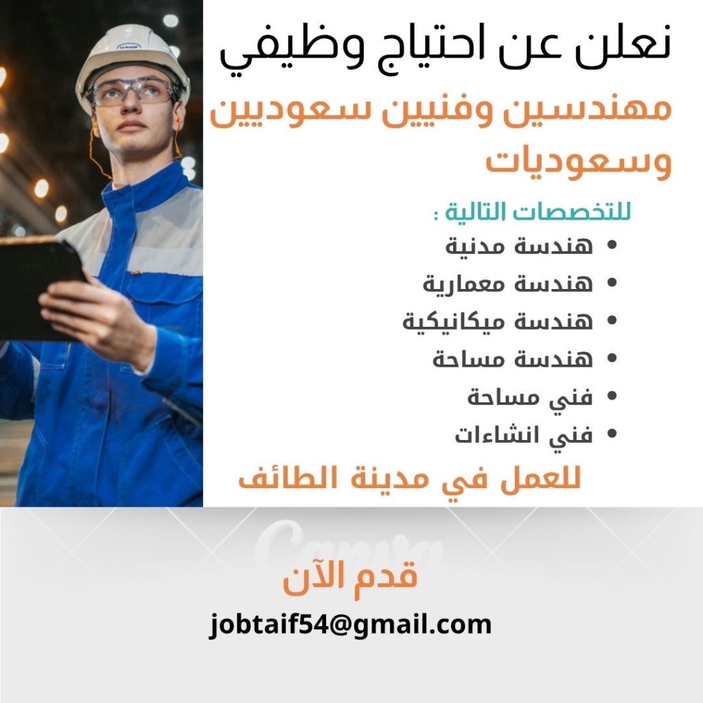 نحن نبحث عن مهندسين وفنيين سعوديين وسعوديات في مجالات الهندسة المدنية، الهندسة المعمارية، الهندسة الميكانيكية، وهندسة المساحة، بالاضافة الى فنيين مساحة ومراقبين انشاءات. اذا كنت ترغب في الانضمام الى فريقنا والعمل في منطقة مكة المكرمة بمدينة الطائف - حي السلامة، يرجى ارسال سيرتك الذاتية ومحفظة أعمالك الى البريد الألكتروني