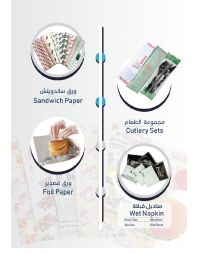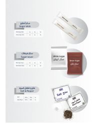 سكر أصابع أبيض وبني - سكر مربعات أبيض وبني - منديل معطر - ورق ساندويتش - ملح وفلفل - أصابع قهوة سريعة التحضير جولد وكلاسيك - أصابع كريمر (مبيض قهوة) مجموعة طعام مغلفه. كل الأصناف يوجد سادة ومطبوع بشعار العميل. ويوجد أكياس سكر 50 كيلو خشن وبودرة