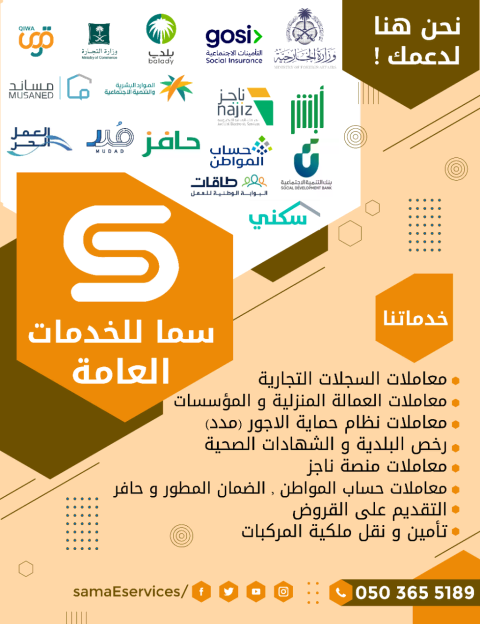 خدماتا خدمات مكتب العمل خدمات وزارة العدل بلدي، التأمينات الاجتماعية مدد وأجور وزارة التجارة توظف سعوده مطالبات مرورية استخراج رخص نقل مركبات تأمين طبي عماله تأمين مركبات كشوفات طبية نقل كفالات تأشيرات عمل دائمه