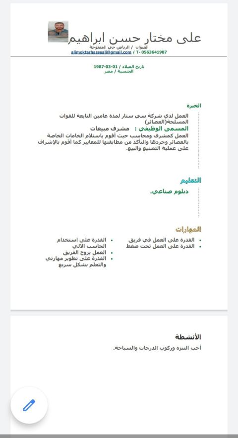 خريج جامعي بمؤهل هندسي خبرة في مجال الحراسات الأمنية لبق حسن السير والسلوك - أجيد الخطابة - خبرة في مجال اعداد التقارير اليومية - أجيد التعامل مع كافة أطياف المجتمع - خبرة في مجال التفاتيش - قوة الملاحظة - امتاز بالخفة والسرعة