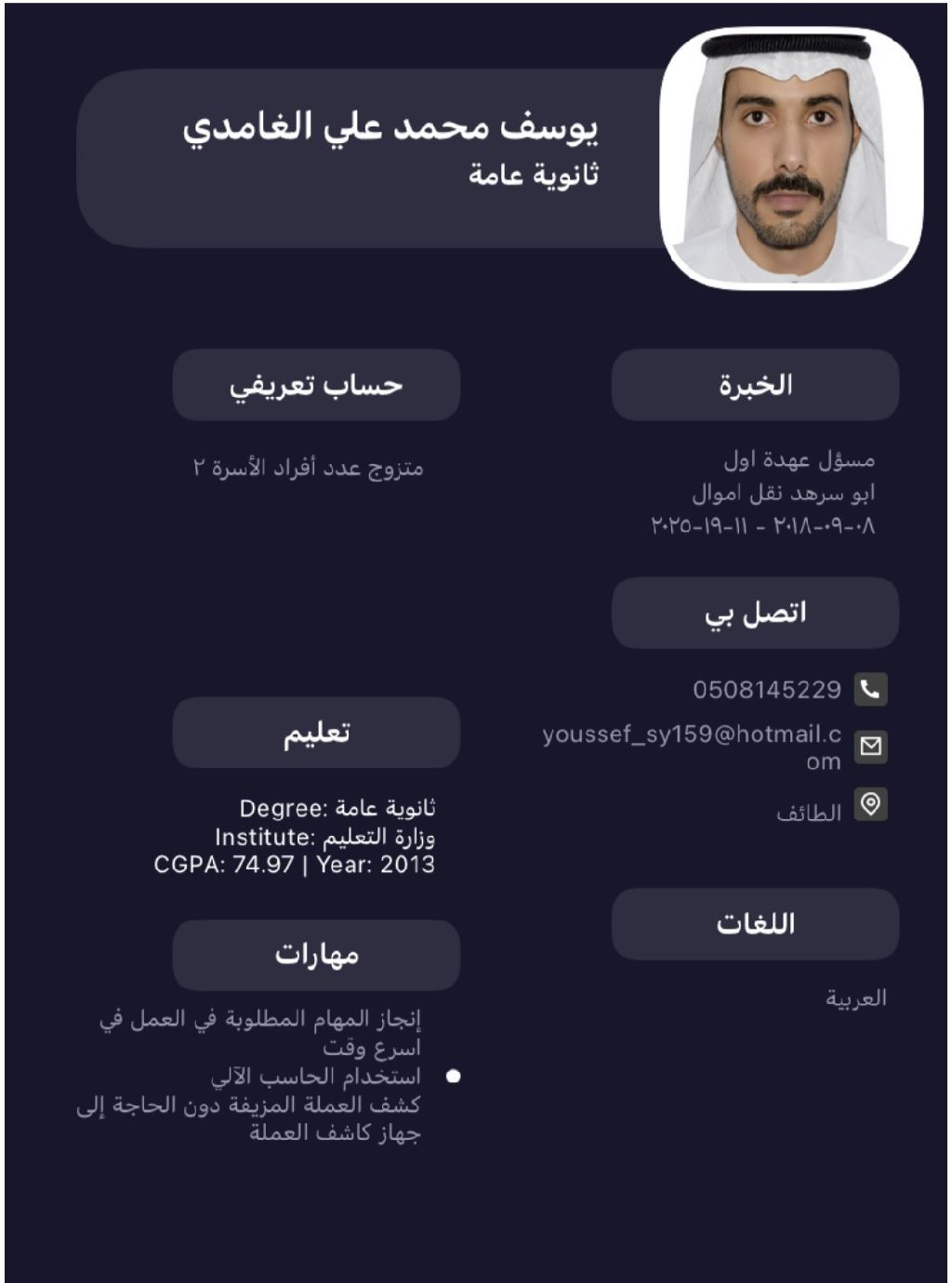 Job seeker in Taif with money transfer, security, and security management companies. Experienced in the field as detailed in my CV