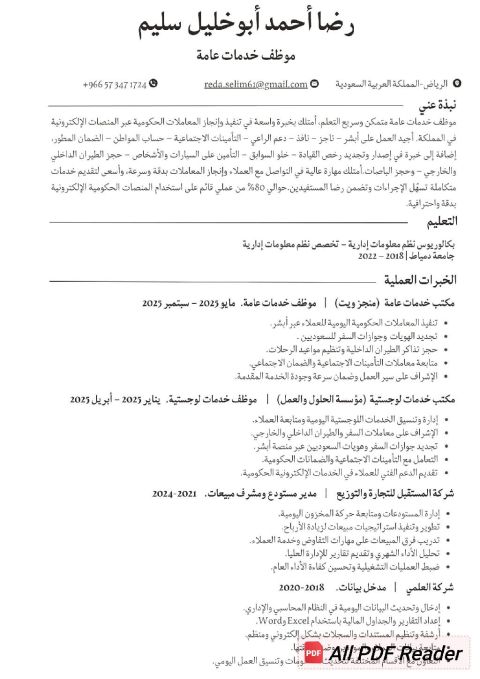 أخصائي تنظيم اداري وتنظيم أعمال الموارد البشرية (مقيم - قوى - التأمينات - مدد) عملت على جميع المنصات الحكومية والاشراف على الأعمال الادارية المختلفة ومتابعة أعمال هيئة الغذاء والاستيراد والتصدير وأعمال السيارات التابعة لوزارة النقل (كروت تشغيل + بطاقات السائقين + تفاويض السيارات + تجديد الاستمارات) يجيد الأعمال الاداريه والاشراف والمتابعة يطلب عمل في وجاهز للعمل فورا تواصل