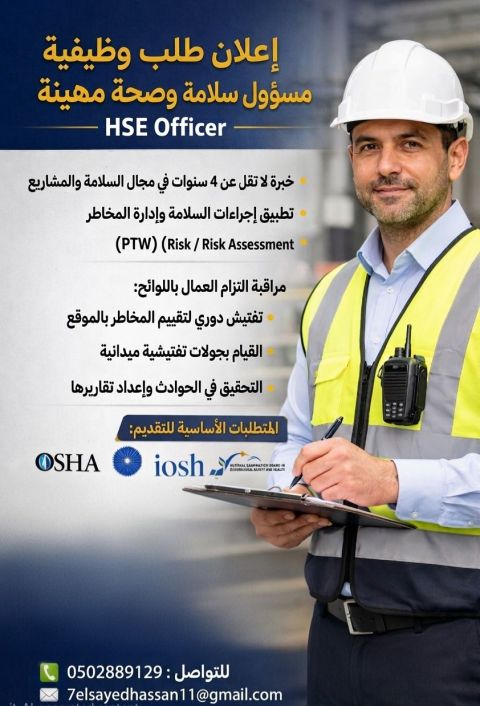 HSE Officer Open to Work Safety Officer with 4 + years of experience in construction and water projects, skilled in risk assessment, PTW system, site inspections, and incident investigation. Certified in OSHA, NEBOSH & IOSH, and approved by National Water Company. Transferable Iqama Available immediately Committed to safety excellence