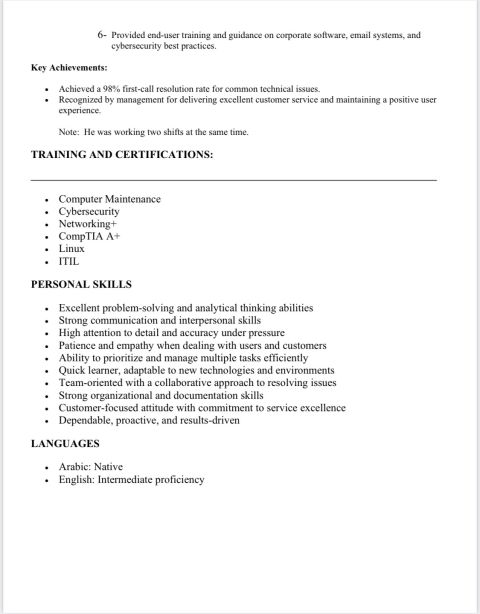أخصائي تقنية معلومات (IT) حاصل على بكالوريوس في تكنولوجيا المعلومات، ابحث عن فرصة عمل في مجال الدعم الفني أو التشغيل التقني. لدي خبرة عملية في المستشفيات والمراكز الطبية، ومتمكن من المهارات التالية الدعم الفني تشخيص واصلاح أعطال الحواسيب، الطابعات والأنظمة البرمجية. إدارة الأنظمة التعامل الاحترافي مع Active Directory، Microsoft 365، وخدمات البريد أ