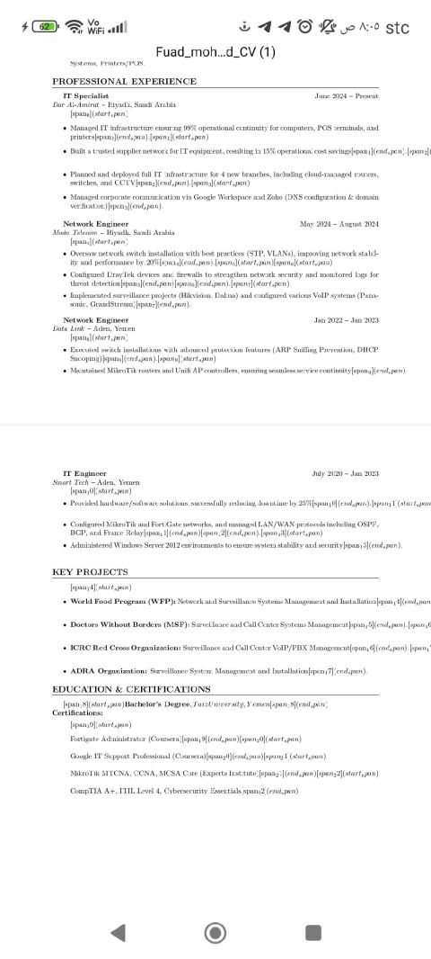 فني شبكات وحاسوب بخبرة في الشبكات، أمن الشبكات، وصيانة الحواسيب، مع معرفة أساسية ببرمجة تطبيقات الموبايل باستخدام Flutter وAndroid. حاصل على دبلوم هندسة بترول (تشغيل وأنظمة تحكم) عملت كمساعد تدريس في هندسة الحاسوب، وفي الدعم الفني وصيانة الأنظمة، اضافة الى خبرة ادارية في ادخال البيانات بقطاع السفر والسياحة. حاصل على شهادات معتمدة أبرزها CCNA وICDL، وأتميز بالعمل تحت الضغط والتعلم السريع
