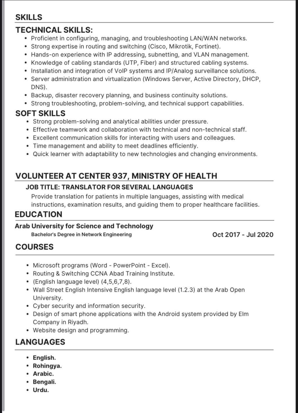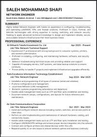 أتشرف بالتقدم لوظيفة أخصائي تقنية معلومات في شركة كم الموقرة، حيث أطمح للمساهمة بخبراتي ومهاراتي التقنية في دعم وتطوير البنية التحتية الرقمية لديكم. أرفقت سيرتي الذاتية لمزيد من التفاصيل حول مؤهلاتي وخبراتي، ويسعدني التحدث معكم في أي وقت مناسب لبحث سبل التعاون. مع خالص التحية والتقدير، م صالح محمد شفيع