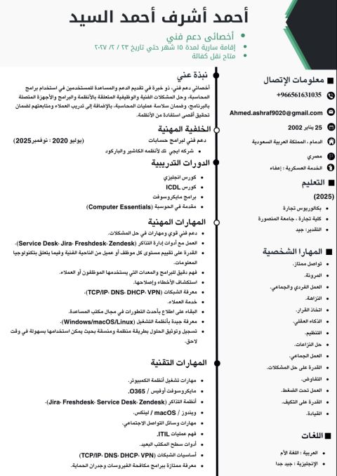 مختص دعم تقنية معلومات يتمتع بخبرة عملية في أعمال مكتب الدعم الفني، ودعم المستخدمين النهائيين، واستكشاف أخطاء الاجهزة والبرامج وإصلاحها، اضافة الى المعرفة الأساسية بالشبكات. لديه خبرة في أنظمة تشغيل ويندوز، وتجهيز الاجهزة، ودعم أصول تقنية المعلومات. متاح للانضمام فورا، ويحمل إقامة قابلة للنقل، ويبحث عن فرصة في مجال تقنية المعلومات للمساهمة بخبراته التقنية والتطور ضمن بيئة عمل احترافية