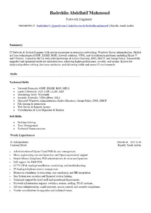 I have 2 years of professional experience in IT support, including 1 year of hands - on experience in Saudi Arabia as an IT support Specialist. I have strong expertise in network support, system troubleshooting, hardware & software issues, and ensuring smooth daily IT operations and reliable technical support for users and organizations