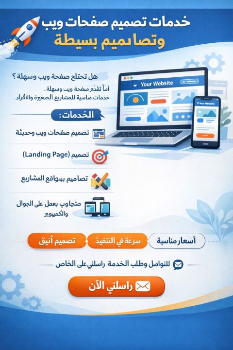 خدمات تصميم صفحات ويب وتصاميم بسيطة هل تحتاج صفحة ويب جميلة وسهلة أنا أقدم خدمات تصميم مناسبة للمشاريع الصغيرة والأفراد. الخدمات تصميم صفحات ويب بسيطة وحديثة - تصميم صفحات هبوط (Landing Page) تصاميم بسيطة للمواقع أو المشاريع - تصميم متجاوب يعمل على الجوال والكمبيوتر تصميم أنيق - سرعة في التنفيذ - أسعار مناسبة للتواصل وطلب الخدمة راسلني على الخاص