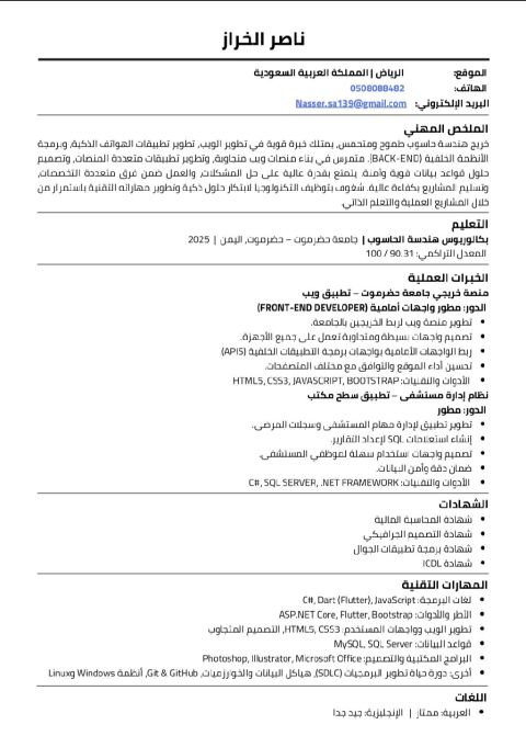 الملخص المهني متخصص في المبيعات والمشتريات وإدارة المعارض بخبرة تزيد عن 12 عاما في شركات التصالت، الصيدليات، وشركات السيتي ارد أو لتصدير. شغلت مناصب متعددة بدء أمن المخازن، المبيعات الميدانية، وحتى إدارة قسم المبيعات أو لمشتريات وإدارة المعرض، امتلك خبرة أوسعة في وضع وتنفيذ أست ارتيجيات المبيعات، تطوير عالقات العمالء، التفاوض مع الموردين، وإدارة فرق العمل، مع قدرة على تحقيق الأهداف