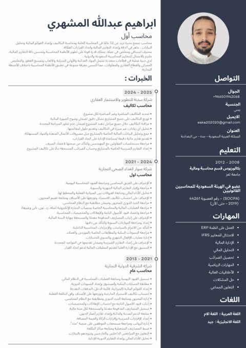 محاسب أول حاصل على عضوية هيئة المحاسبين (SOCPA) بخبرة تزيد عن 12 عاما في المحاسبة العامة واعداد القوائم المالية وتحليل البيانات ماهر في الدقة واعداد التقارير المالية واتخاذ القرارات الفعالة. محترف استباقي ومخلص في عملي، امتلك قدرة قوية على تطوير الأنظمة المحاسبية وتحسين دقة التقارير المالية، ملتزم بالامتثال للمعايير المحاسبية السعودية والدولية لدي خبرة عملية في قطاعات متعددة أنشطة تجارية