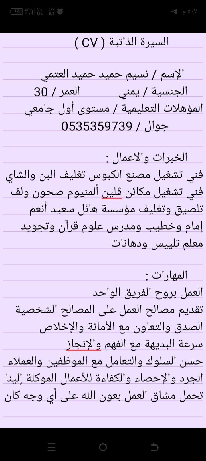 أخوكم نسيم حميد من اليمن ابحث عن أي شغل في أي مكان في المملكة عملت في الشاليهات والمصانع والتتليس وإماما للمساجد ومدرسا للطلاب وابحث عن أي عمل