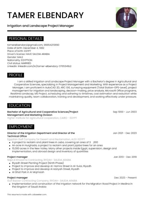 مهندس ري ولاند سكيب، حيث امتلك خبرة عملية في تنفيذ وإدارة مشاريع الري وأعمال اللاند سكيب ضمن شركات المقاولات، مع تركيز قوي على خفض التكاليف، كفاءة التنفيذ، والالتزام بالبرامج الزمنية. أتمتع بخبرة متميزة في تصميم وتنفيذ شبكات الري (تنقيط - رش - ري أوتوماتيك) بما يحقق ترشيد استهلاك المياه ورفع كفاءة التشغيل. اعداد المخططات التنفيذية (Shop Drawings) وحساب الكميات (BOQs) بما يتوافق مع متطلبات المشروع