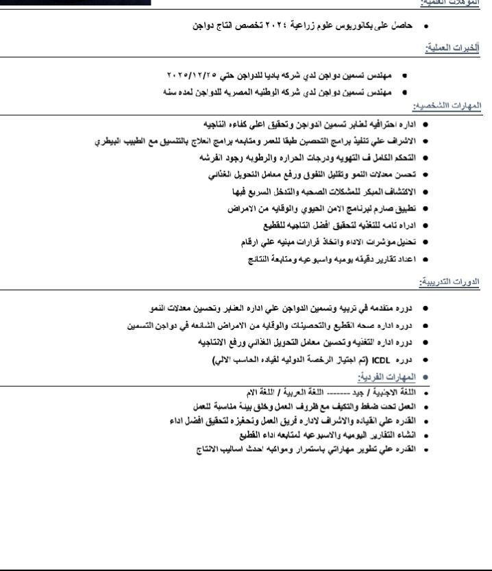 مهندس انتاج وتسمين دواجن لدي خبرة ثلاث سنوات في مزارع تسمين الدواجن، أدير العنابر من بداية الدورة الى التسويق، واشتغل على رفع الانتاجية وتقليل النفوق. إدارة كاملة للقطيع ومتابعة الأداء اليومي، خبرة في التحصينات والتعامل مع الأمراض، تحسين معامل التحويل الغذائي وتقليل الخسائر، ضبط التهوية وجودة الفرشة والظروف البيئية، اعداد التقارير اليومية ورفعها للإدارة. ولدي اقامة سارية وتسهيلات نقل كفالة