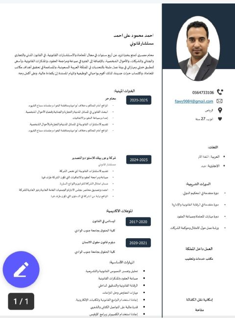 أنا مستشار قانوني مصري حاصل على ماجستير في العلوم الاقتصادية والمالية وماجستير آخر في التجارة الدولية والاستثمار، ولي خبرة في كتابة المذكرات القانونية ولوائح الاعتراض وصحائف الدعاوى (تجاري - عمالي - اداري) وصياغة العقود وتأسيس الشركات وتسجيل العلامات التجارية وابحث عن فرصة عمل بالمملكة