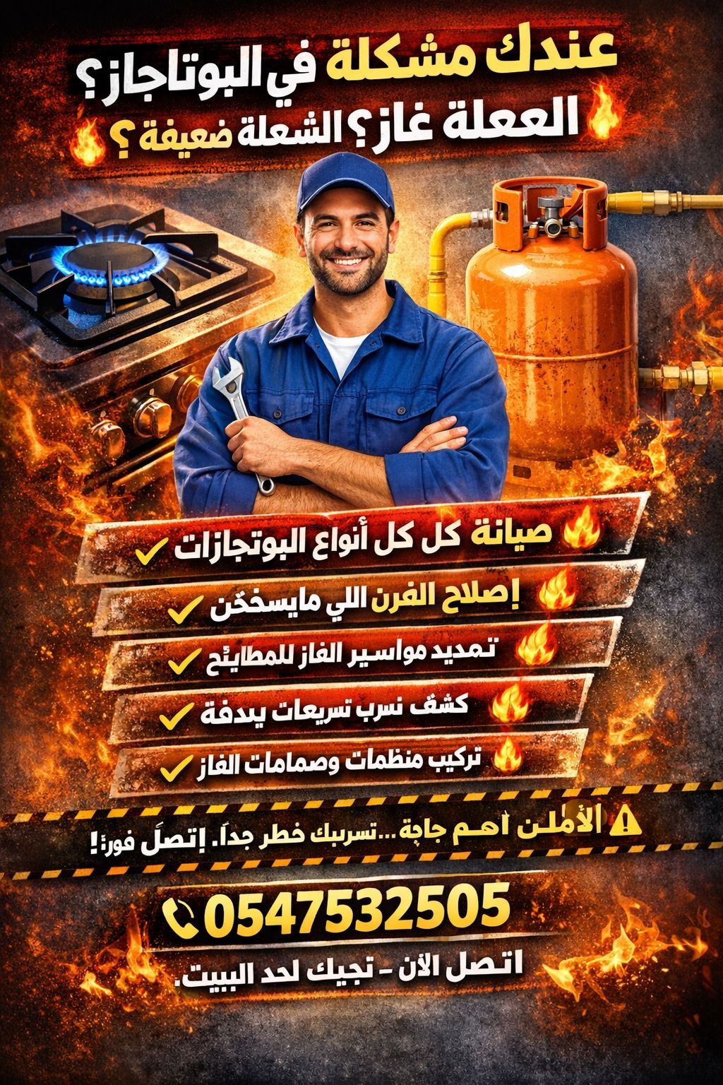 عندك مشكلة في البوتاجاز ريحة غاز الشعلة ضعيفة متخليش المشكلة تكبر الحل عندنا صيانة جميع أنواع البوتاجازات اصلاح الفرن اللي مايسخنش تركيب عيون وشعلات جديدة تمديد مواسير الغاز للمطابخ كشف واصلاح تسريبات الغاز بدقة تركيب منظمات وصمامات الغاز الأمان أهم حاجة تسريب الغاز خطر جدا، اتصل فورا. شغل نظيف - خبرة - أسعار مناسبة للحجز والاستفسار